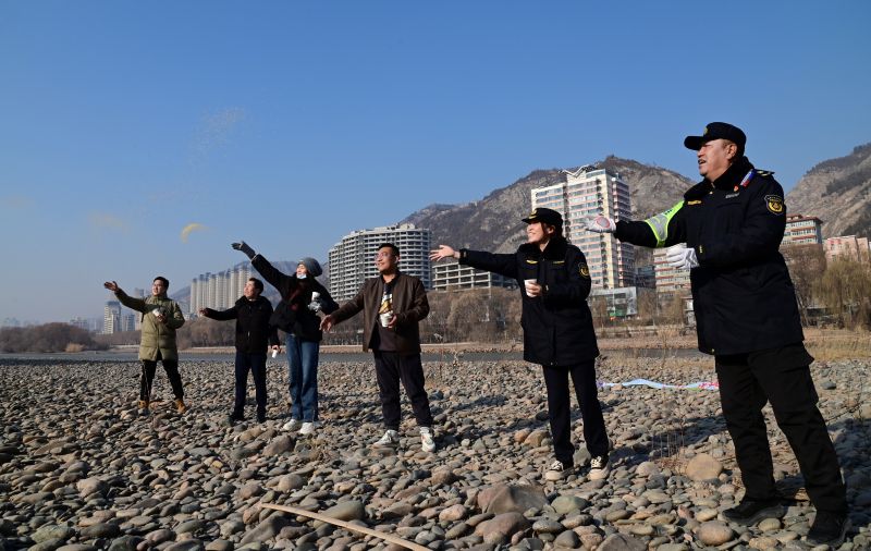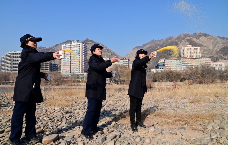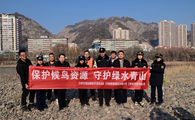 12月17日,蘭州市交通運輸綜合行政執法隊聯合蘭州水運集團有限公司,組織志愿者在黃河母親雕像附近的淺灘上開展“保護候鳥資源 守護綠水青山”冬季候鳥投食活動,用100公斤愛心谷物,為黃河蘭州段的越冬候鳥撐起“食物保護傘”。新甘肅·甘肅經濟日報記者 瞿娟 攝